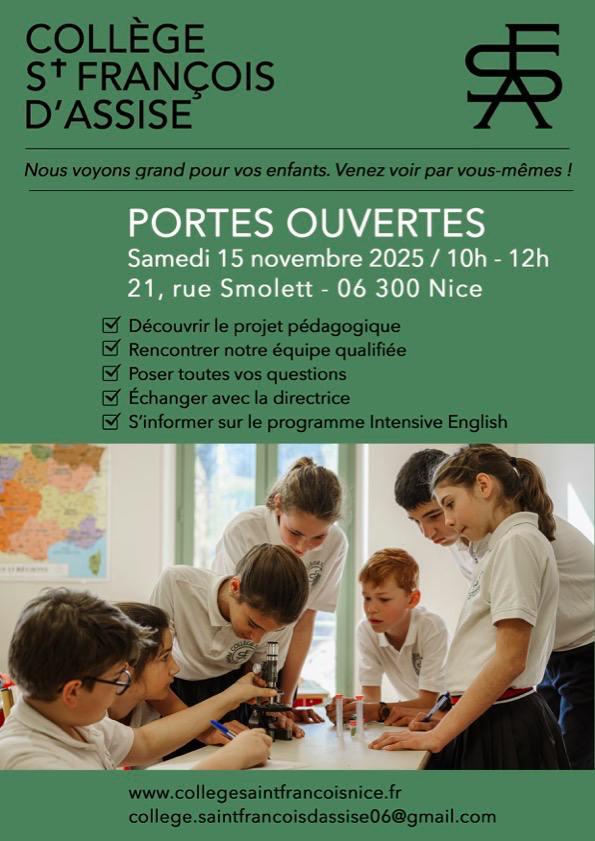 Le collège Saint François d’Assise de Nice vous accueille pour sa journée portes ouvertes le SAMEDI 15 NOVEMBRE 2025
